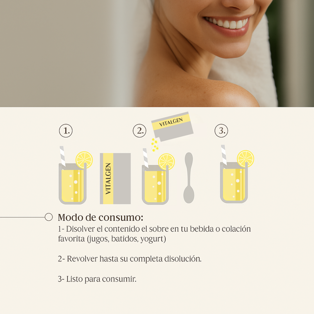 VITALGEN es un suplemento dietario a base de Colágeno Hidrolizado, Vitamina C, Coenzima Q10 y Resveratrol.