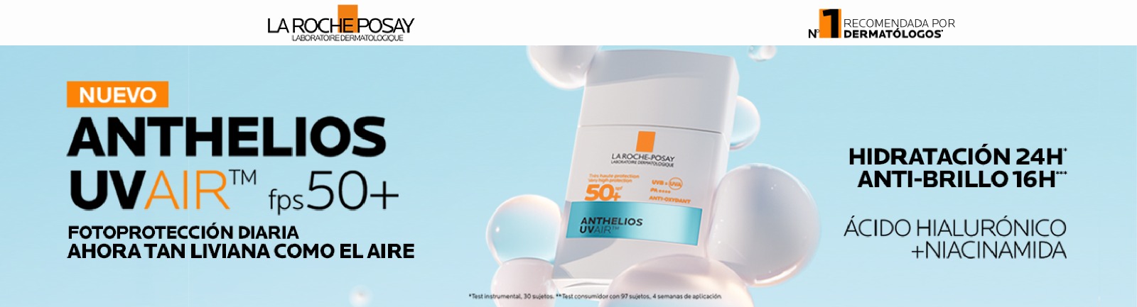 Anthelios UV air SPF 50+ de La Roche-Posay es un protector solar facial de alta eficacia, formulado para brindar una defensa invisible y liviana contra los rayos UVA y UVB. Su textura ultrafluida está potenciada con tecnología UVair™, que proporciona una película protectora aireada, no grasa y de rápida absorción. Es hipoalergénico, no comedogénico y apto para pieles sensibles, incluso grasas. Además, contiene ácido hialurónico y niacinamida, activos dermocosméticos que hidratan, calman y protegen la piel del estrés oxidativo.